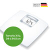 Denominación del producto : Balanza de baño / Pilas : 2 pilas de 1,5 V AAA / Pantalla con retroiluminación : Sí / Mecanismo de encendido : Quick-Start / Tamaño de la superficie de pesaje en cm : 34 x 34,5 / Dimensiones del producto en cm : 34 x 34,5 x 3,5 / Capacidad de carga/precisión : 180 kg / 100 g / Cambio : kg/lb/st / Tamaño de los números en mm : 39 / CE : Sí